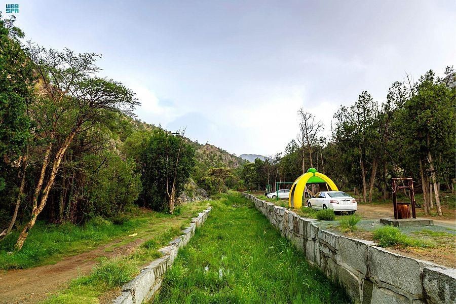 اكتست جبالُ وسفوحُ وأوديةُ منطقةِ الباحة باللون الأخضر بعد هطول الأمطار عليها مؤخرًا، حيث نبتت الأشجار بجميع أنواعها وسط جريان المياه المتدفقة من الجبال إلى بطون الأودية.