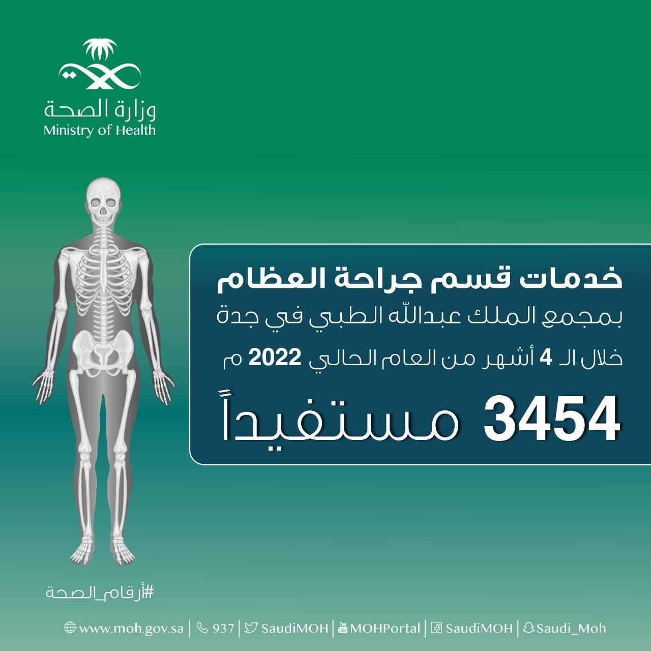 قدّم قسم جراحة العظام بمجمع الملك عبدالله الطبي في جدة خدماته الطبية خلال الـ 4 أشهر من العام الحالي 2022م لـ 3454 مستفيداً عبر غرف العمليات وعيادات جراحة العظام الخارجية والتي تنوعت ما بين حالات مرضية وحالات جراحية وحالات إصابات الكسور والحوادث، وبيّنت الإحصائية إجراء نحو 89 عملية ، فيما سجلت عيادات العظام وصول 3365 مراجعاً.