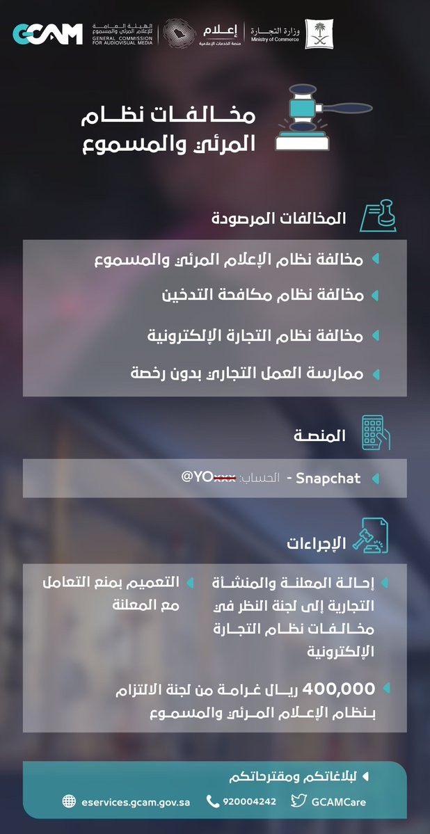 وأوضحت أنها أصدرت غرامة بـ400 ألف ريال على زائرة عربية وتعميمًا بعدم التعامل معها أو الإعلان لديها، وذلك بسبب مخالفتها نظامي المرئي والمسموع والتجارة الإلكترونية.