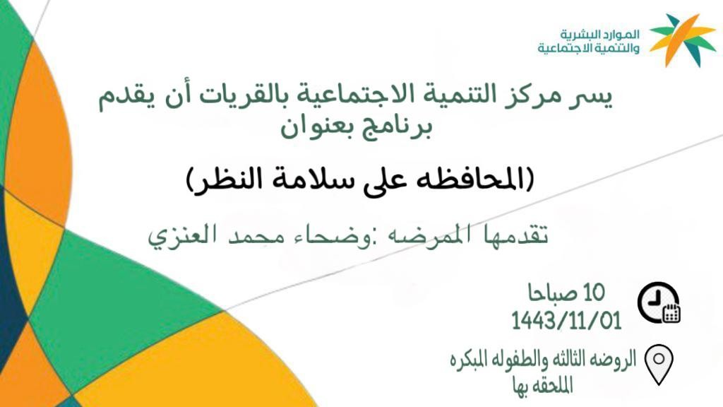 اقام مركز التنميه الاجتماعيه بمحافظة القرياتمحاضرة بعنوان ( المحافظة على سلامة النظر ) بمقر الروضه الثالثه والطفوله المبكره الملحقه بها يوم الثلاثاءالموافق١ /١١/ ١٤٤٣ هـ قدمتها الممرضه / وضحاء محمد العنزي تناولت فيها اهميه المحافظه على النظر والطرق الصحيحه للمحافظه على سلامة النظر بالاضافه الي الطريقه الصحيحه لنظافة العين والمحافظه على النظافه الشخصيه للطفل بشكل عام .