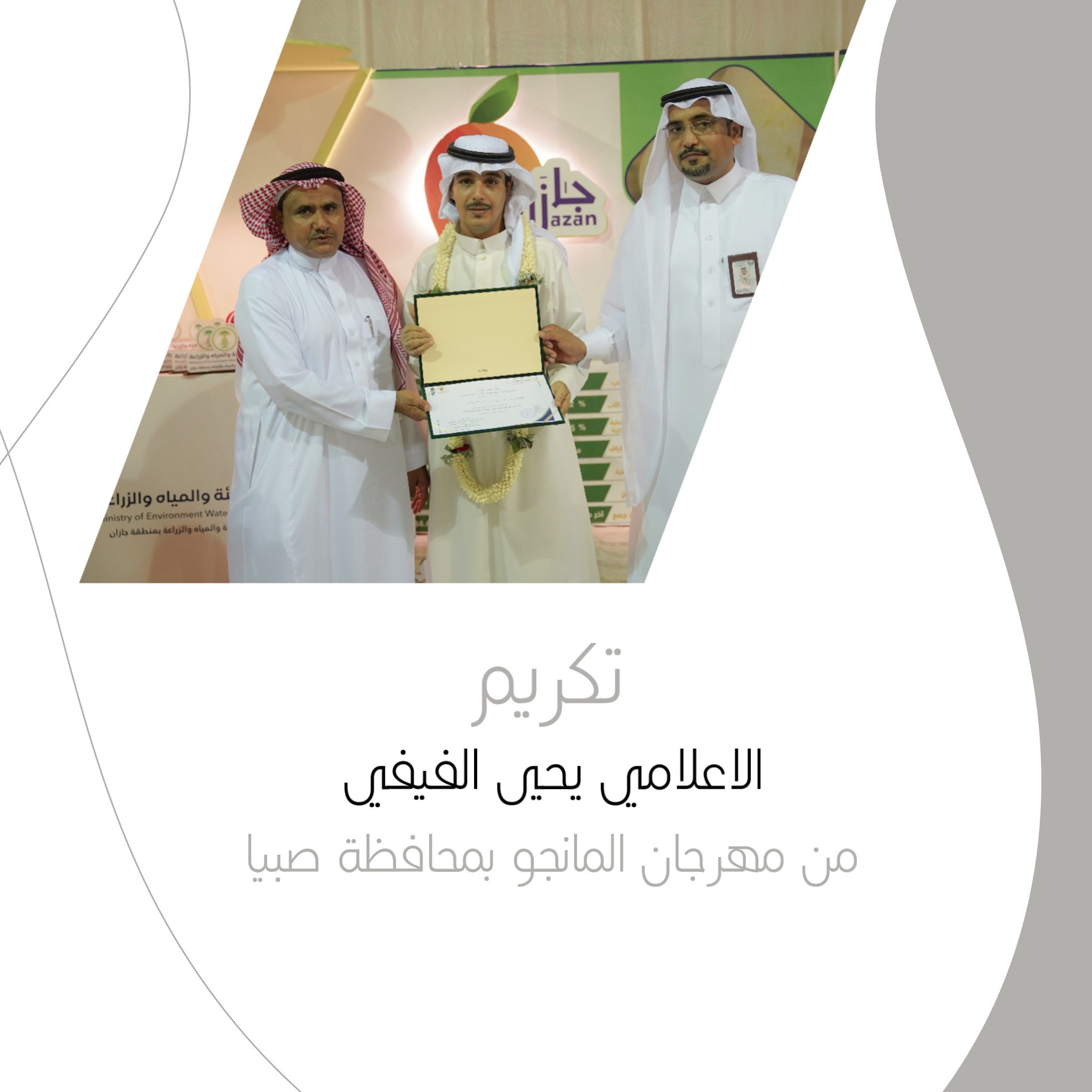 وذلك نظراً هذا التكريم لحضوره ومشاركته وتغطياته الإعلامية في مهرجان المانجو والفواكه الاستوائية بمحافظة صبيا لعام 2022م، وجاء التكريم خلال الحفل الختامي للمهرجان الذي أقيم في حديقة الملك فهد بجادة صبيا.