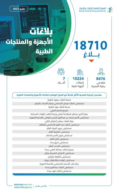 فيما يعتبر انعكاسًا لزيادة وعي المستخدمين ومقدمي الرعاية الصحية والمؤسسات الطبية في المملكة؛ تَلَقّت هيئة الغذاء والدواء 18710 بلاغات حول الأجهزة والمنتجات الطبية خلال شهر مايو من عام 2022.