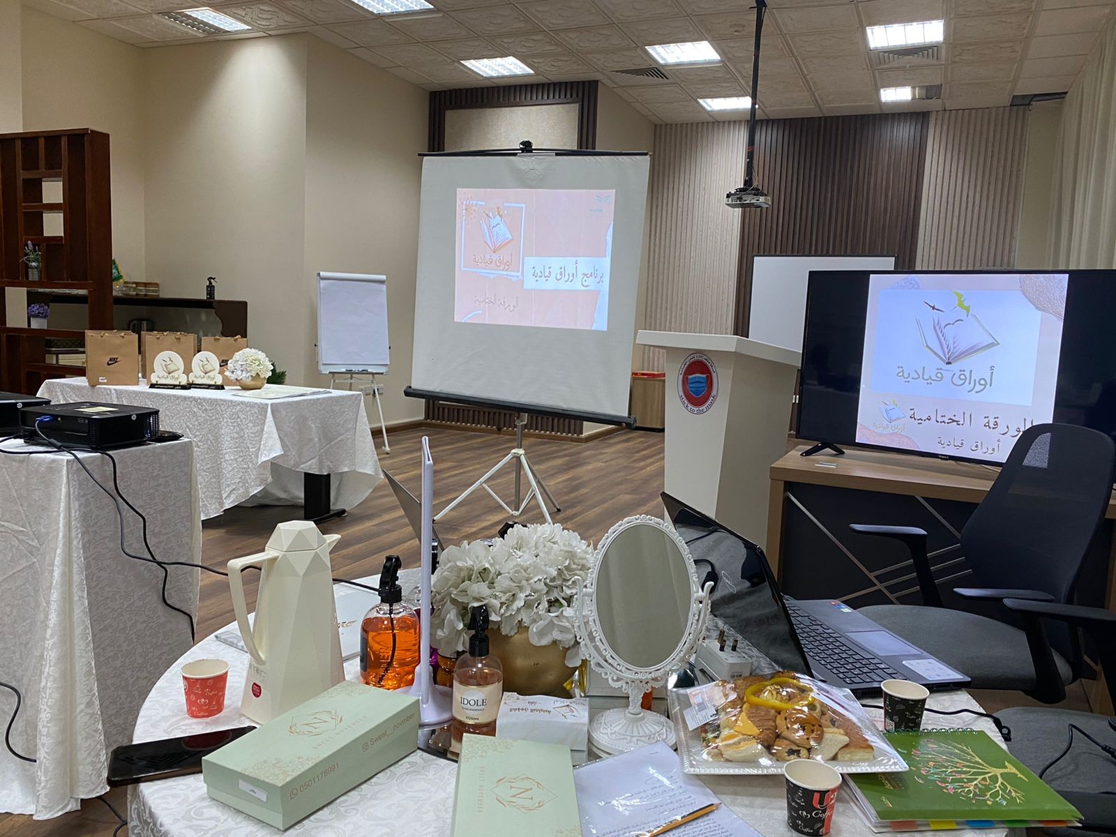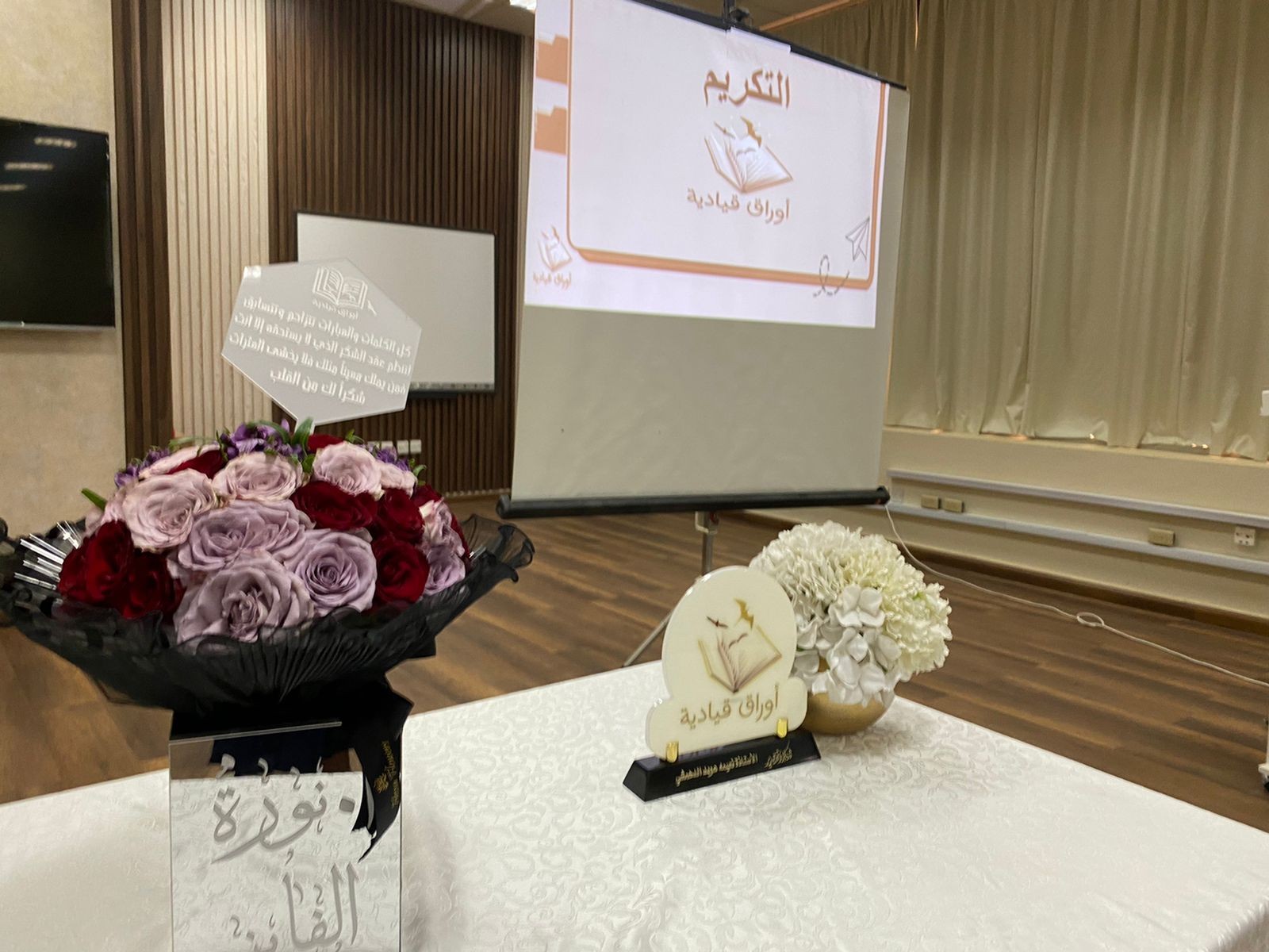 برعاية مساعد المدير العام للشؤون التعليمية (بنات) الأستاذة نوره عبد العزيزالفايز وحضور مديرات الإدارات والمشرفات التربويات وقيادات من كلية التقنية والغرفة التجارية والتنمية الاجتماعية والأحوال المدنية نفذ فريق برنامج أوراق قيادية (الورقة الختامية) في قاعة قيادات .حيث بدأ الحفل الختامي للبرنامج باية من الذكر الحكيم ثم حديث شريف وبدأت الفقرات بمقدمة من الأستاذة فوزة نايف عن القيادة حيث قدمة ورقتها الأستاذة مرام مشاري بعنوان مهارات القائد قدم بعدها الفريق نشاط عن المادة السابقة وقدمت جوائز للفائزين فيها .