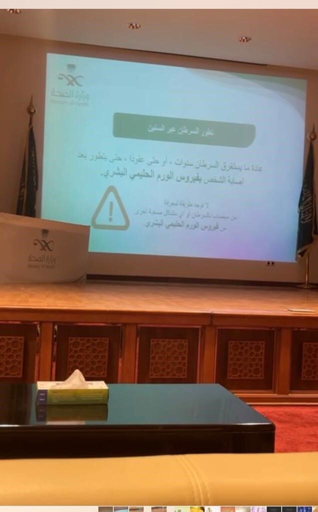 شاركت الإدارة العامة للتعليم بمنطقة مكة المكرمة ممثلة بالشؤون الصحية المدرسية في التوعية بمرض فيروس الورم الحليمي من خلال مشاركتها في محاضرة ( حملات التطعيم ضد فيروس الورم الحليمي لطالبات الصف الأول المتوسط )، التي نفذتها المديرية العامة للشؤون الصحية بمنطقة مكة المكرمة وذلك يوم الثلاثاء الموافق 8/ 11 / 1443هـ، بقاعة المحاضرات بمركز التدريب بمستشفى الولادة والأطفال بمكة المكرمة من قبل المنفذين: ملاذ البشير أحمد البشير أخصائي الطب الوقائي والصحة العامة من إدارة الصحة العامة من المديرية العامة للشؤون الصحية بمنطقة مكة المكرمة، و أسامة علي صالح من برنامج التحصين الموسع بإدارة الطب الوقائي من التجمع الصحي بمكة المكرمة.