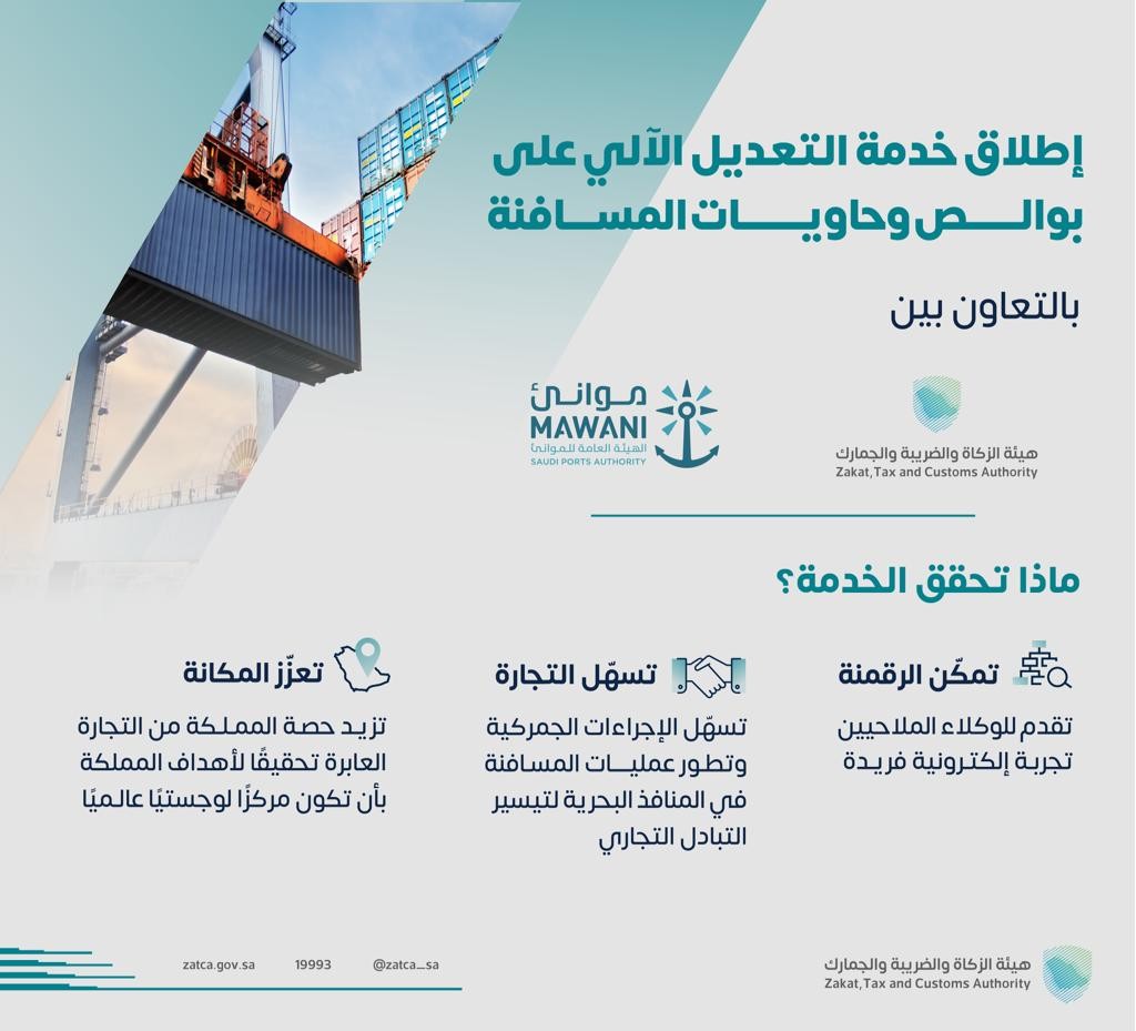 أطلقت هيئة الزكاة والضريبة والجمارك خدمة الموافقة الآلية لطلبات الحذف والإضافة لبوالص وحاويات المسافنة في مَنافست التصدير وذلك بالتعاون مع الهيئة العامة للموانئ "موانئ" لتشمل الخدمة جميع موانئ المملكة.