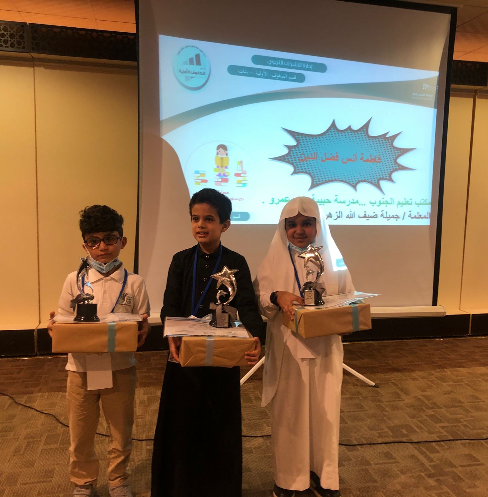 وفي الختام جاء إعلان الطلبة الفائزين بالمراكز الأولى: الصف الأولى بنين الطالب عبدالهادي العلياني من مدرسة الزهراء الابتدائية، الصف الثاني محمد سعد المالكي من ابتدائية الملك خالد والصف الثالث الطالب ذو النون عماد يوسف من مدرسة الإمام البخاري. أما البنات من الصف الأول الطالبة فاطمة أنس من مدرسة حبيبة بنت عمرو، الصف الثاني دانة غرم الله الزهراني من مدرسة فاطمة بنت عبدالملك والصف الثالث حلا بكر الزهراني الابتدائية الثالثة والثلاثون بعد المائة.