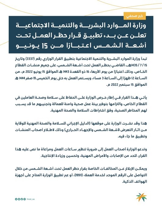 تبدأ وزارة الموارد البشرية والتنمية الاجتماعية بتطبيق القرار الوزاري رقم (3337) وتاريخ 15/ 7/ 1435هـ، القاضي بمنع العمل تحت أشعة الشمس، على جميع منشآت القطاع الخاص، وذلك اعتبارًا من يوم الأربعاء 16 ذو القعدة 1443 هـ الموافق 15 يونيو 2022 م، من الساعة 12 ظهرًا إلى الساعة 3 مساءً، ويستمر العمل به حتى يوم الخميس 19 صفر 1444 هـ الموافق 15 سبتمبر 2022 م.