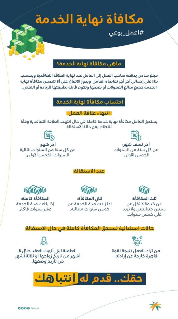 وأبانت في “إنفوجراف” نشرته على حسابها الرسمي بـ”تويتر”، أنه يتم احتساب مكافأة نهاية الخدمة بناءً على آخر أجر تقاضاه الموظف، وعدد السنوات التي قضاها في العمل لدى صاحب العمل.