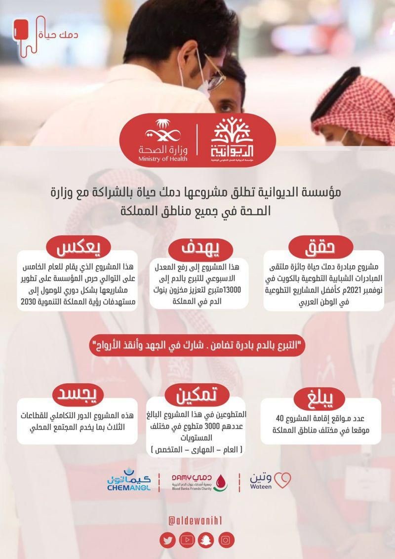 تطلق مؤسسة الديوانية للعمل التطوعي الوقفية، مشروع مبادرة "دمك حياة "بالشراكة مع وزارة الصحة و جمعية الكوثر الصحية و جمعية التنمية الأهلية بأبها و نادي أبها الرياضي و وزارة الرياضية فرع منطقة عسير و ذلك في اليوم العالمي للمتبرعين بالدم 14 يونيو 2022م في مجمع الراشد مول لمدة ثلاثة أيام تحت عنوان "التبرع بالدم بادرة تضامن. شارك في الجهد وأنقذ الأرواح" الذي يهدف إلى شكر المتبرعين بالدم وتقديرهم وتسعى "مؤسسة الديوانية" لإقامة مبادرات نوعية ذات أثر واستدامة في كافة المجالات التي تستهدف المجتمع المحلي ومحيطه، وتنفذ هذه المبادرة على مستوى المملكة في جميع المناطق بقيادة نخبة من القياديين في العمل التطوعي وللعام الخامس على التوالي وتستهدف هذه المبادرة أيضاً الوصول إلى ثلاثة عشر ألف متبرع وثلاثة ألاف متطوع خلال أيام الحملة وقد حصلت المبادرة في عام 2021م على جائزة ملتقى مبادرات الشباب التطوعية والانسانية بدولة الكويت كأفضل المشاريع التطوعية في الوطن العربي ، ومن جهته قال رئيس مجلس إدارة المؤسسة المهندس عبدالحميد الرفاعي، إن المبادرة تهدف إلى زيادة الوعي حول أهمية التبرع بالدم تطوعاً وتشجيع افراد المجتمع على التبرع بالدم لتحفيز المتبرعين وتحسين تجربة المتبرع بشكل مستمر ودائم مما يساهم في تحقيق الاكتفاء الذاتي لبنوك الدم في المملكة.