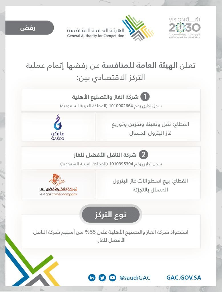 هيئة المنافسة ترفض صفقة إستحواذ (غازكو) على 55% من (شركة الناقل الأفضل للغاز)