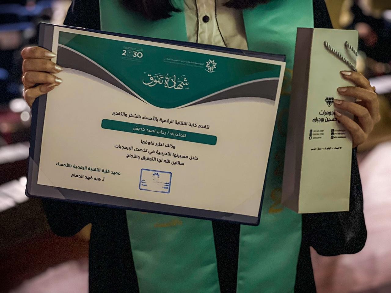 و اختتمت كلمتها بتذكير الخريجات بأنهم انتقلت من مرحلة التدريب و المهارات الى ميدان العمل و المهنة و أكدت عليهن بأن يكونوا جزءا فعالا فيفي تحقيق رؤية المملكة نحول التحول الرقمي المنشود