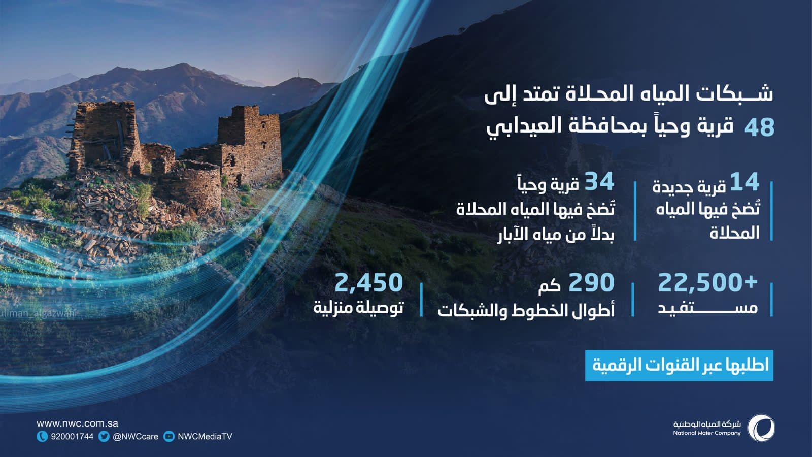 ودعا مدير عام وحدة أعمال المياه بمنطقة جازان المستفيدين الذين تم تركيب العدادات لهم إلى زيارة الفرع الإلكتروني لشركة المياه الوطنية لتحديث بياناتهم، وطلب تفعيل الخدمة، مشيرًا إلى أنه يمكن للمستفيدين من خدمات المياه في القرى المغطاة بشبكات المياه، تقديم طلب الحصول على توصيلة منزلية جديدة عن طريق القنوات الرقمية لشركة المياه الوطنية.