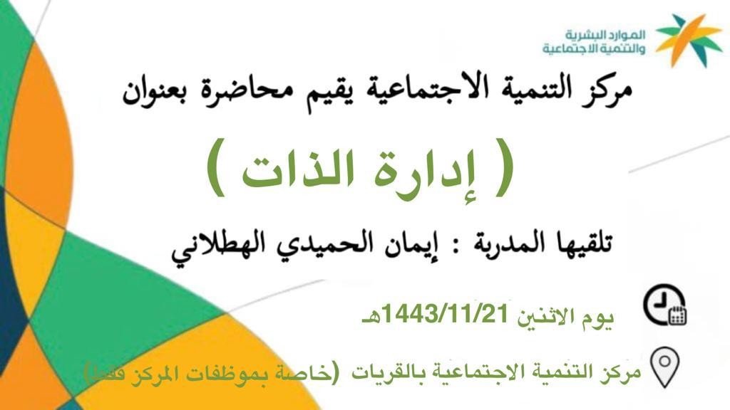 أقام مركز التنمية الاجتماعية بمحافظة القريات محاضرة بعنوان ( إدارة الذات) لمنسوباته بالقسم النسائي قدمتها المدربه / إيمان الهطلاني .