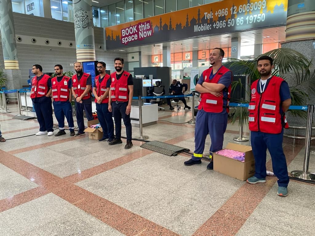 استقبلت الفرق التوعوية والتطوعية لهيئة الهلال الأحمر السعودي، وفود الحجاج القادمين بمطار الملك عبدالعزيز الدولي بجدة، بالورود، والمظلات الواقيه للشمس، والإرشادات التوعوية الإسعافية؛ لرفع الوعي الإسعافي لدى الحجاج، وذلك من منطلق الحرص على المحافظة على صحة حجاج بيت الله الحرام وسلامتهم.