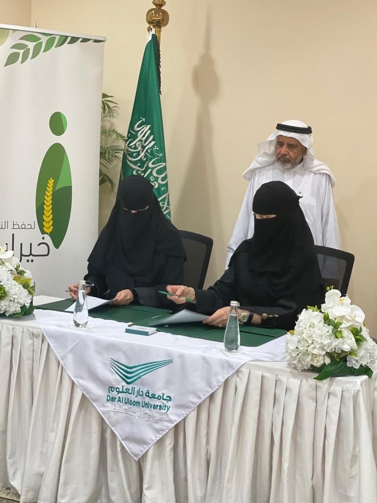 مثل جمعية خيرات لحفظ النعمة في الاتفاقية المدير التنفيذي أ غادة العبيدان ومن جانب جامعة دار العلوم أ د ايمان المدني مشرفة مركز التعليم المستمر وخدمة المجتمع في الجامعة