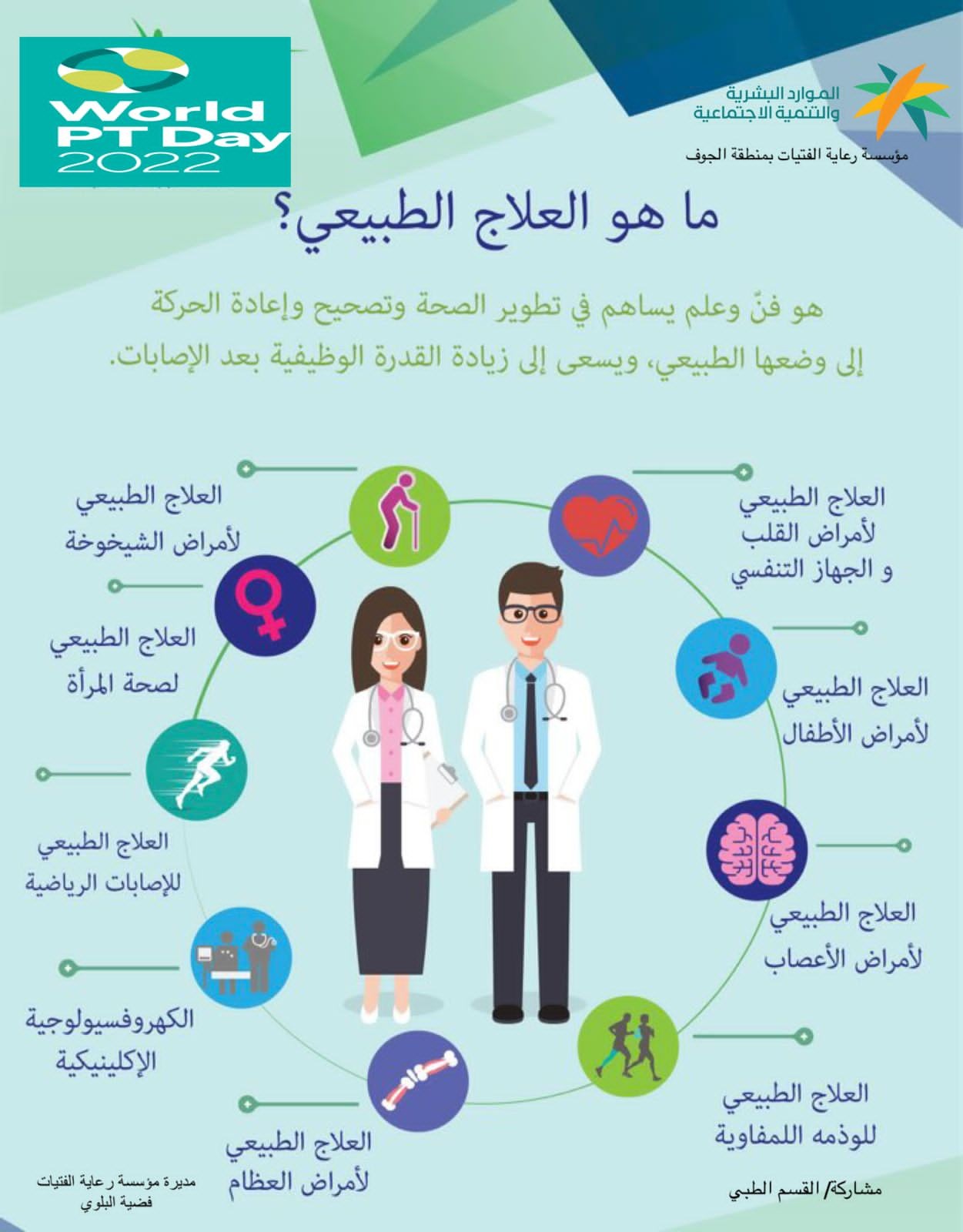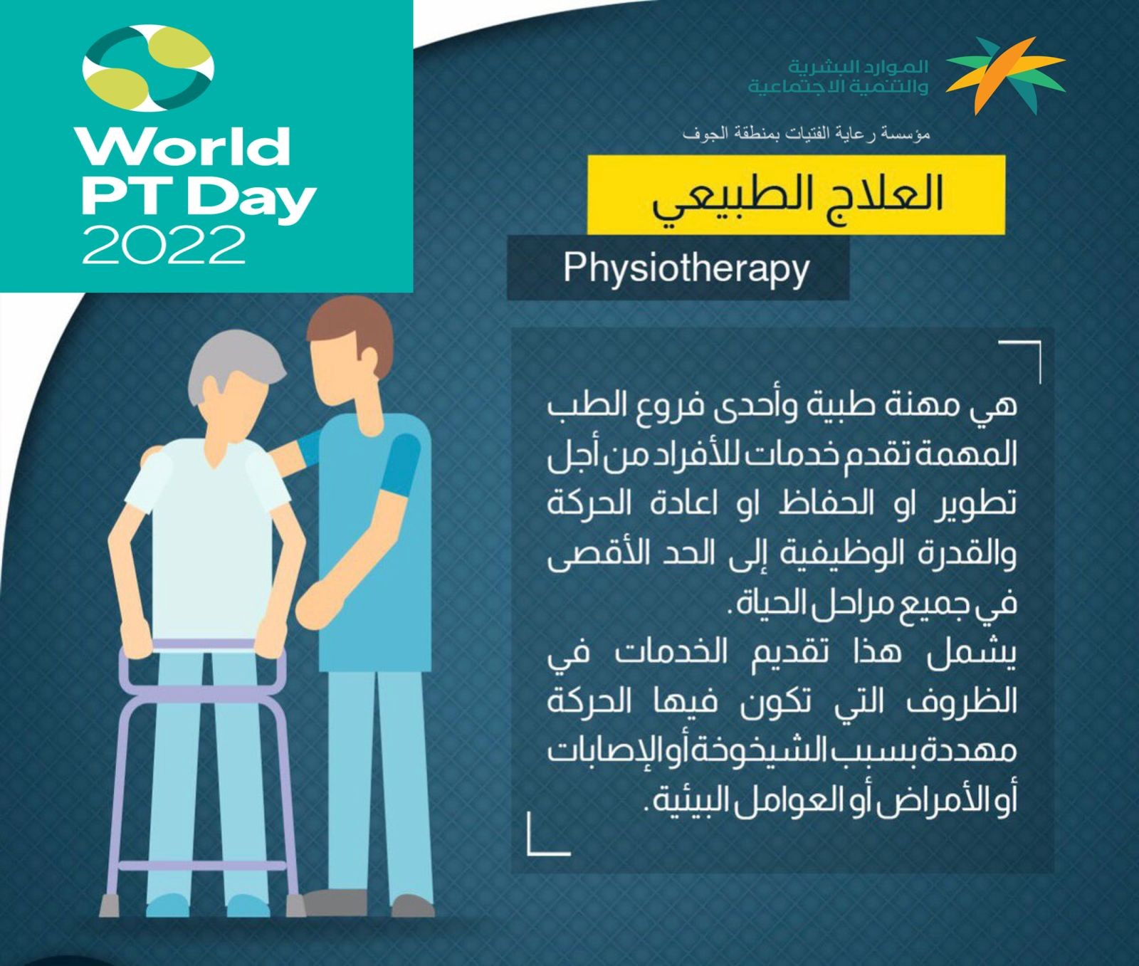 فعلت مؤسسة رعاية الفتيات بمنطقةالجوف اليوم العالمي للعلاج الطبيعي والذي يصادف يوم الخميس ٨سبتمبر ٢٠٢٢ والذي يهدف للتوعية وتقديم النصائح في مجال العلاج الطبيعي ٠