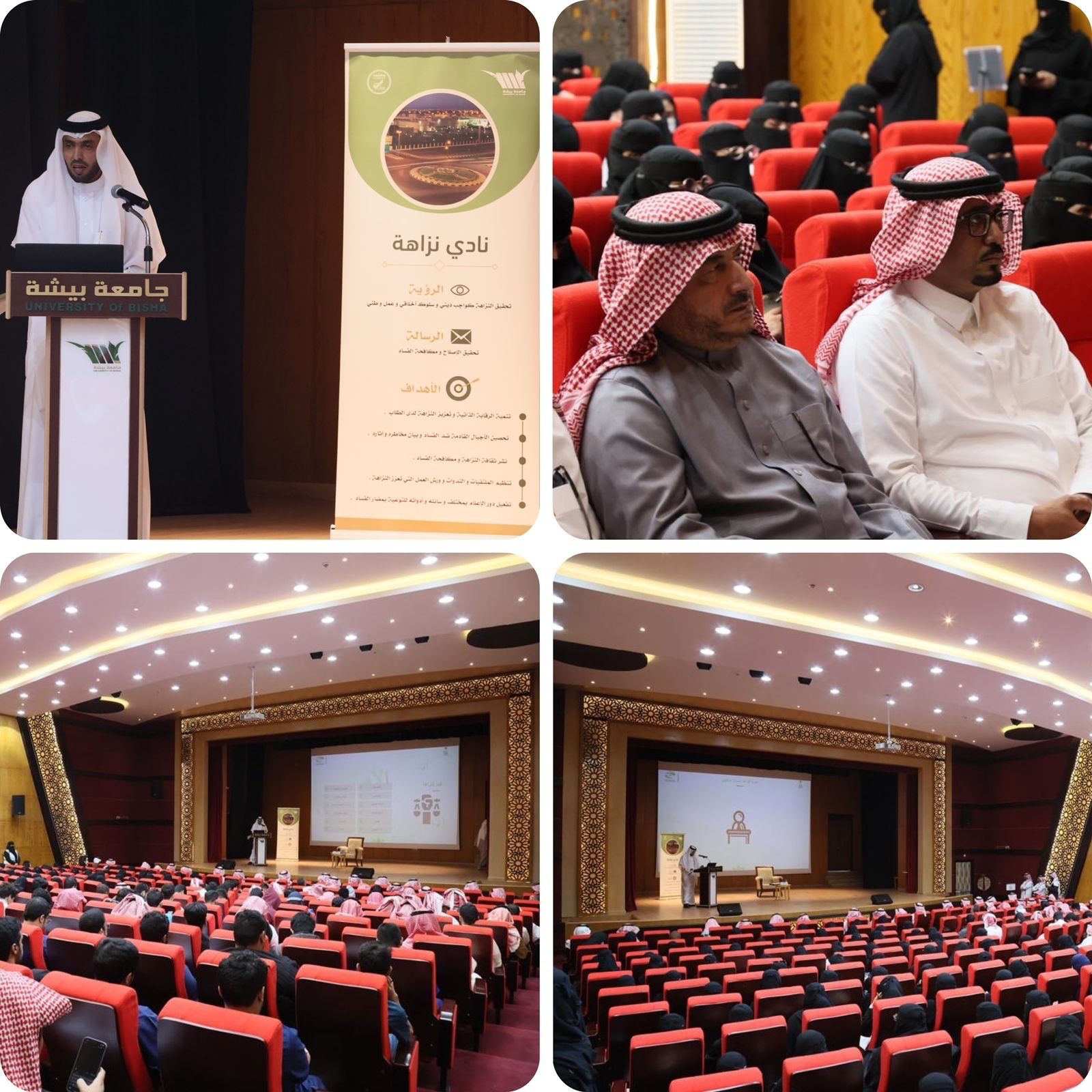 أقامت جامعة بيشة، مُمثلةً في نادي نزاهة بعمادة شؤون الطلاب،اليوم، محاضرة بعنوان "تعزيز قيم النزاهة ومكافحة الفساد في بيئة العمل"، وذلك بمسرح الإبداع، برعاية وحضور سعادة رئيس الجامعة أ.د محمد بن محسن صفحي، وعددٍ من القيادات الأكاديمية والإدارية ومنسوبي ومنسوبات الجامعة والطلاب والطالبات.