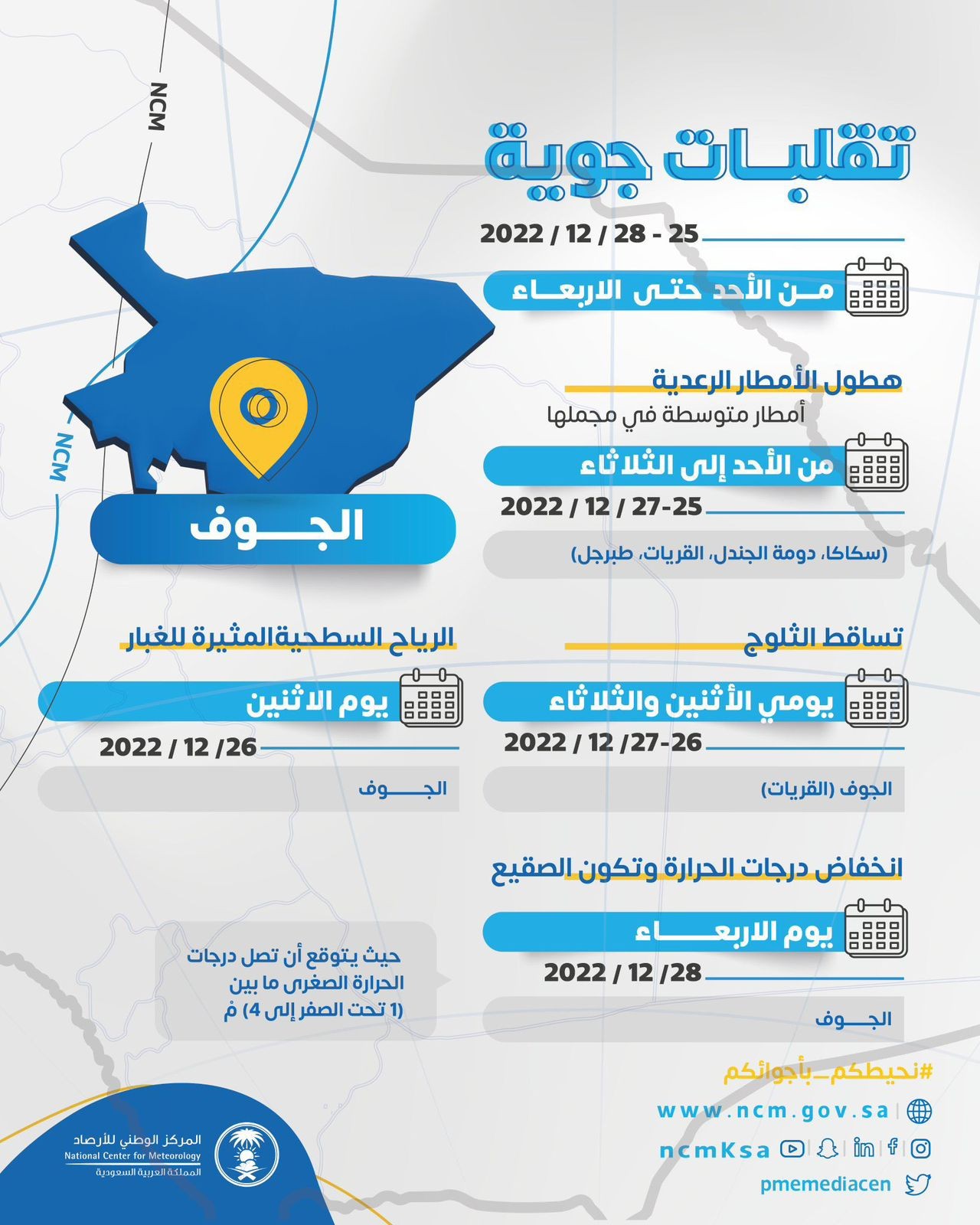 أعلن المركز الوطني السعودي للأرصاد أن منطقة الجوف وخاصة في محافظات ( سكاكا ، دومة الجندل،  القريات ، سكاكا طبرجل) سوف تشهد هطول أمطار متوسطة ابتداءا من مساء اليوم الأحد وحتى يوم الثلاثاء القادم الموافق ٣ جمادى الآخرة ١٤٤٤ هـ .