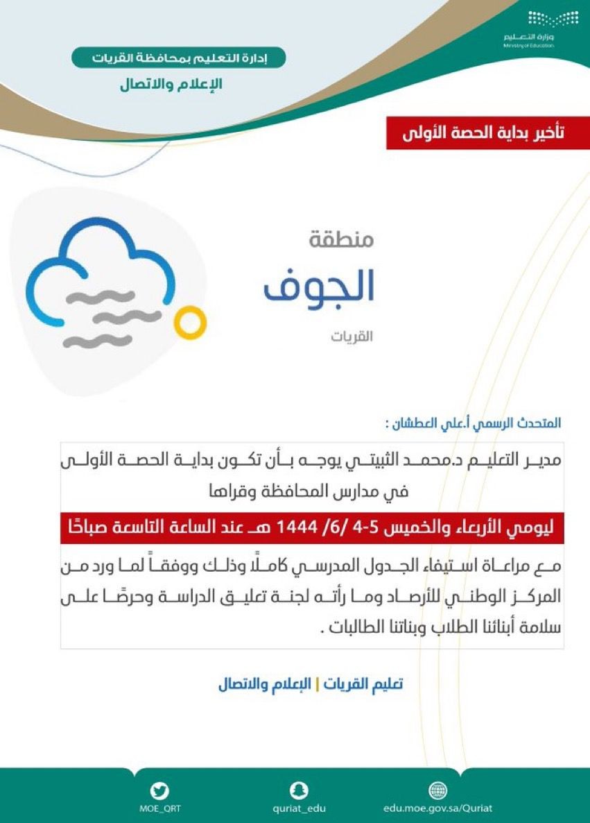 أعلنت إدارت التعليم بمحافظة القريات، عن تأخير بداية الدوام الرسمي لجميع مدارس المحافظة وقراها إلى الساعة التاسعة صباحاً، ليومي الأربعاء والخميس 4-5 /6/ 1444 هـ .