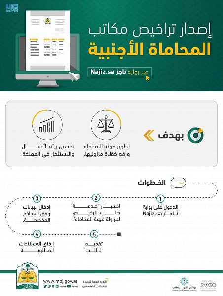 أعلنت وزارة العدل عن إتاحة خدمة تقديم طلب الحصول على ترخيص بمزاولة مهنة المحاماة لمكاتب المحاماة الأجنبية عبر بوابة الخدمات العدلية الإلكترونية “ناجز”، بهدف رفع وتطوير مهنة المحاماة، ورفع كفاءة مزاوليها، وتحسين بيئة الأعمال والاستثمار في المملكة.