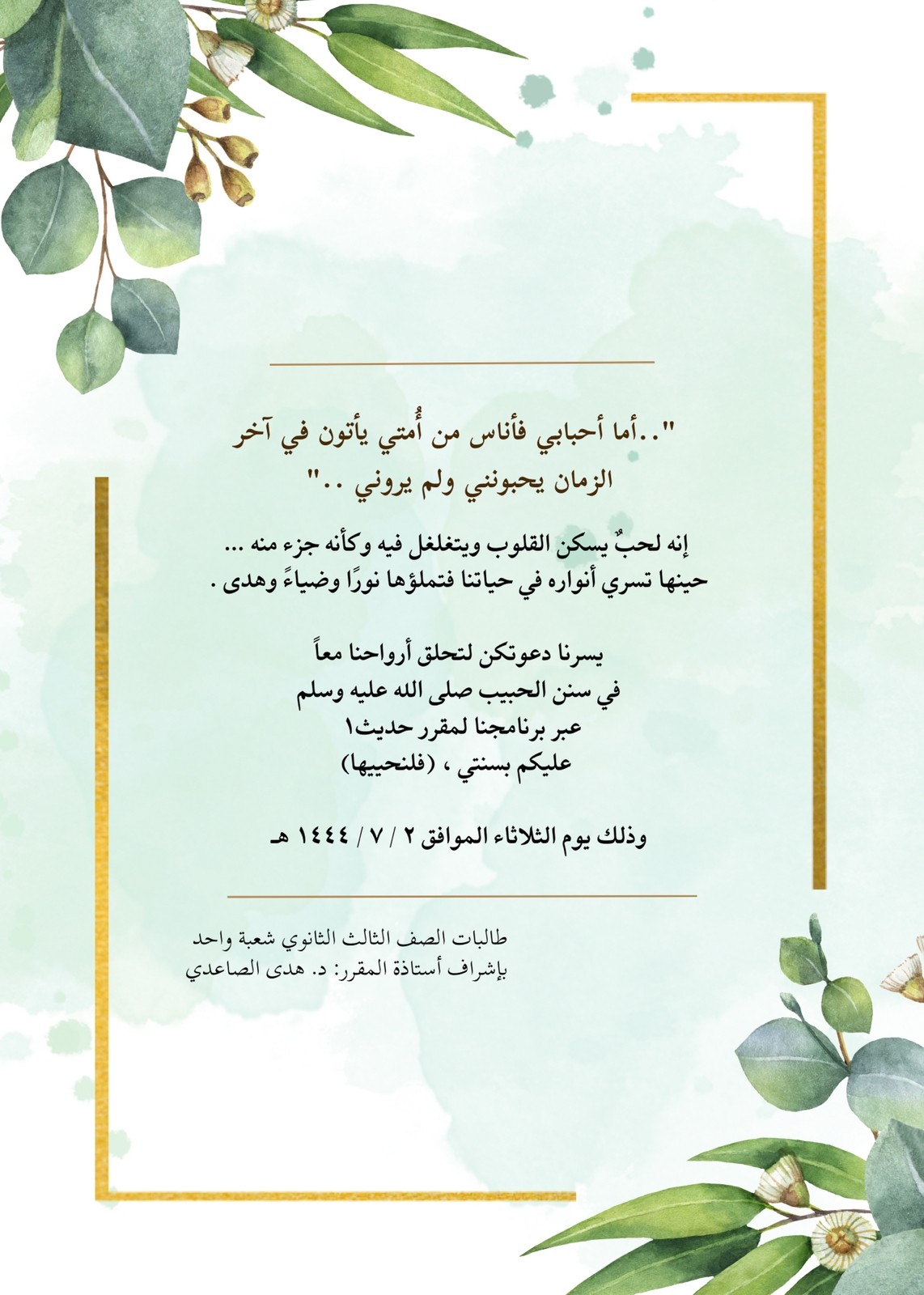 نفذت ثانوية فاطمة الزهراء التابعة لمكتب تعليم شمال مكة بالإدارة العامة للتعليم بمنطقة مكة المكرمة يوم الثلاثاء الموافق 2/7/1444هـ، برنامجاً توعوياً بعنوان (فلنحييها) من قبل طالبات الصف الثالث ثانوي بمساندة المعلمة هدى الصاعدي ومتابعة مشرفة التربية الإسلامية نادية الصاعدي وذلك بهدف إحياء السنن النبوية المهجورة.