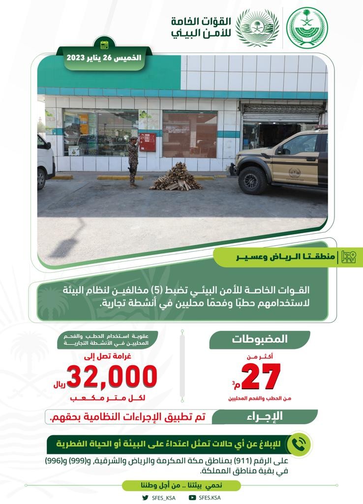 وأوضح المتحدث الرسمي للقوات الخاصة للأمن البيئي، العقيد عبدالرحمن العتيبي، أنه تم تطبيق الإجراءات النظامية بحقهم، وتسليم الكميات المضبوطة للجهات المختصة بوزارة البيئة والمياه والزراعة، مؤكدّا أن عقوبة استخدام الحطب والفحم المحليين في الأنشطة التجارية غرامة تصل إلى (32) ألف ريال لكل متر مكعب.