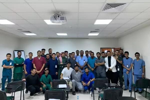 د. ياسر بابكر بشرح وتطبيق طريقة الإنعاش القلبي الرئوي على دمى تحاكي الواقع ومن ثم توزيع المتدربين في غرف المحاكاة والتدريب على طريقة الإنعاش القلبي الرئوي عمليا.