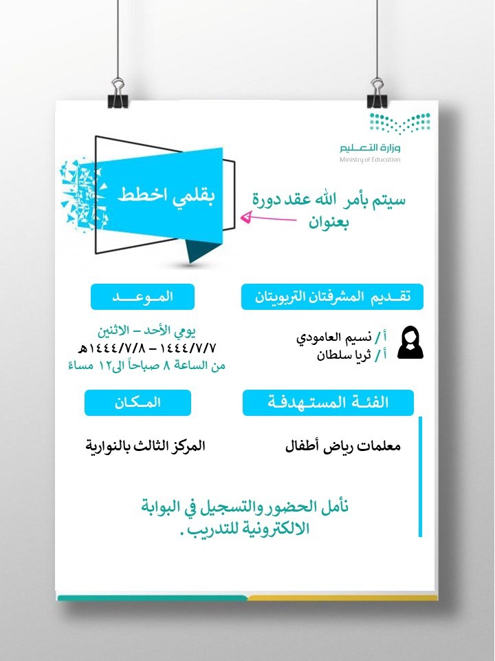 نفذت الإدارة العامة للتعليم بمنطقة مكة المكرمة ممثلةً بإدارة الطفولة المبكرة يومي الأحد والإثنين الموافق 7 -8 /7 / 1444هـ، برنامجاً تدريبياً بعنوان بقلمي أخطط نفذهُ مشرفتا رياض الأطفال نسيم العامودي، ثريا سلطان بإشراف مديرة الإدارة زكية الصبحي.