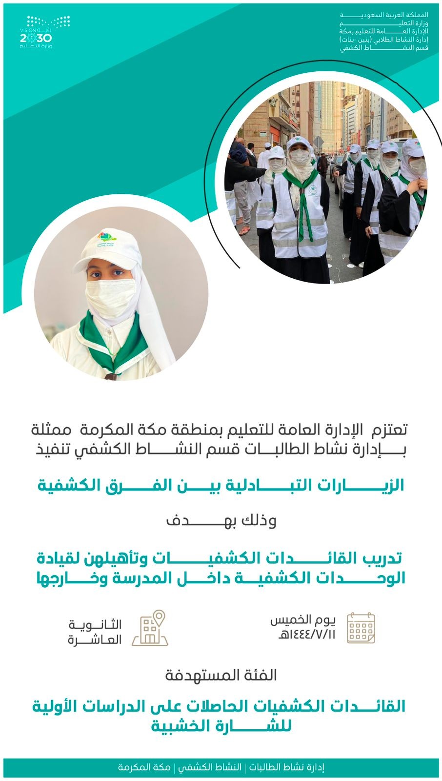 أطلقت الإدارة العامة للتعليم بمنطقة مكة المكرمة ممثلة بإدارة نشاط الطالبات -قسم النشاط الكشفي- الزيارات التبادلية بين الفرق الكشفية يوم الخميس الموافق 11 / 7 /1444 هـ، نفذتها مشرفة إدارة نشاط الطالبات عبير الغريبي بالثانوية العاشرة وذلك بالتعاون القائدات الكشفيات تحت إشراف مديرة الإدارة د. ليلى الصاعدي .