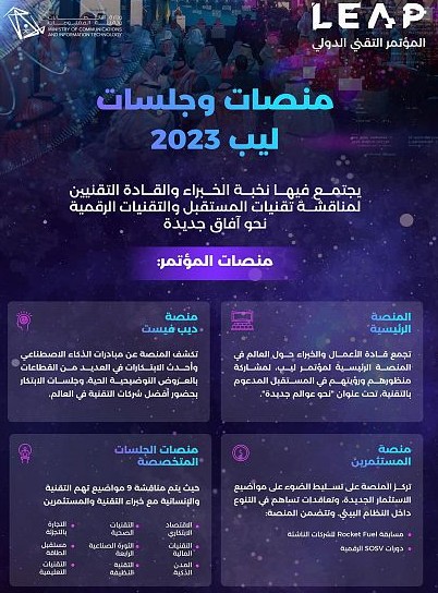 ويأتي مؤتمر ليب 23 بتنظيم من وزارة الاتصالات وتقنية المعلومات بالتعاون مع «الاتحاد السعودي للأمن السيبراني والبرمجة والدرونز» وشركة «تحالف»، حيث تجمع منصاته المبتكرين والتقنيين لتمكين رواد الأعمال، وتعزيز الابتكار التقني وفتح آفاق جديدة بهدف ترسيخ وتعزيز مكانة المملكة كمركز إقليمي للتقنية والابتكار.