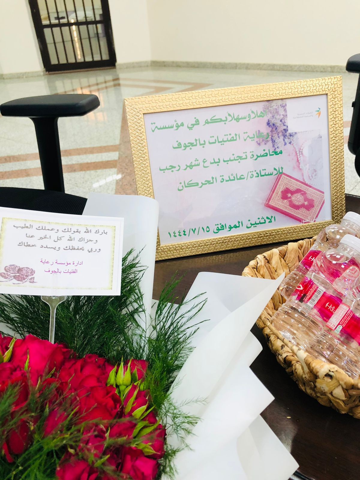 أقامت مؤسسة رعاية الفتيات بالجوف بالتعاون مع مكتب الدعوة والإرشاد بسكاكا محاضرة توعوية ضمن خطة البرامج بالمؤسسة لمسوباتها بعنوان (محاربة بدع شهر رجب )اليوم الاثنين ١٤٤٤/٧/١٥هـ وقدمتها الداعية /عائدة الحركان.