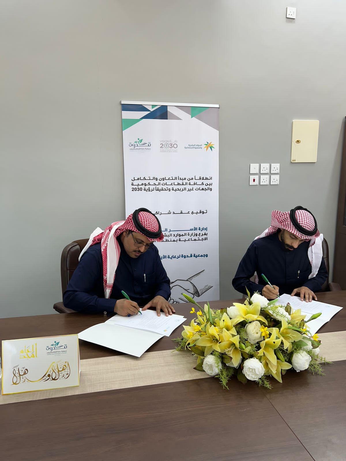 وقع فرع وزارة الموارد البشرية والتنمية الاجتماعية بمنطقة الجوف ممثلا بإدارة الاسر الكافلة عقد شراكة مع جمعية قدوة لرعاية الايتام بالجوف مثل الفرع مدير ادارة الاسر الكافلة الاستاذ/ راشد بن محمد القحطاني و مثل جمعية قدوة الاستاذ/ محمد بن سالم الابراهيم .