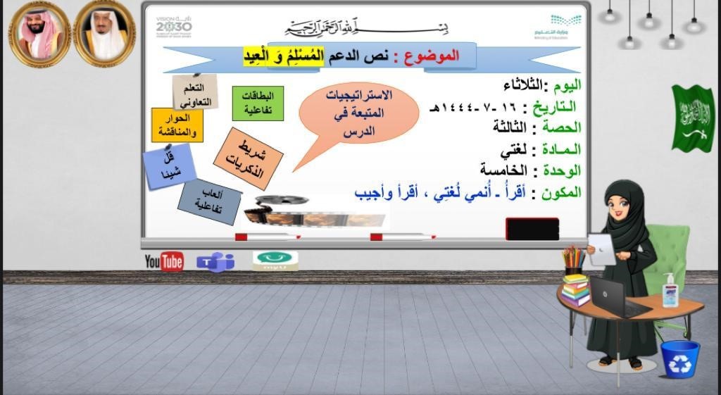 نفذت الابتدائية الرابعة والأربعون التابعة لإدارة التعليم المستمر بإدارة التعليم بمنطقة مكة المكرمة، اليوم الثلاثاء الموافق 16/7/1444هـ، درساً تطبيقاً لمادة لغتي بعنوان (المسلم والعيد).