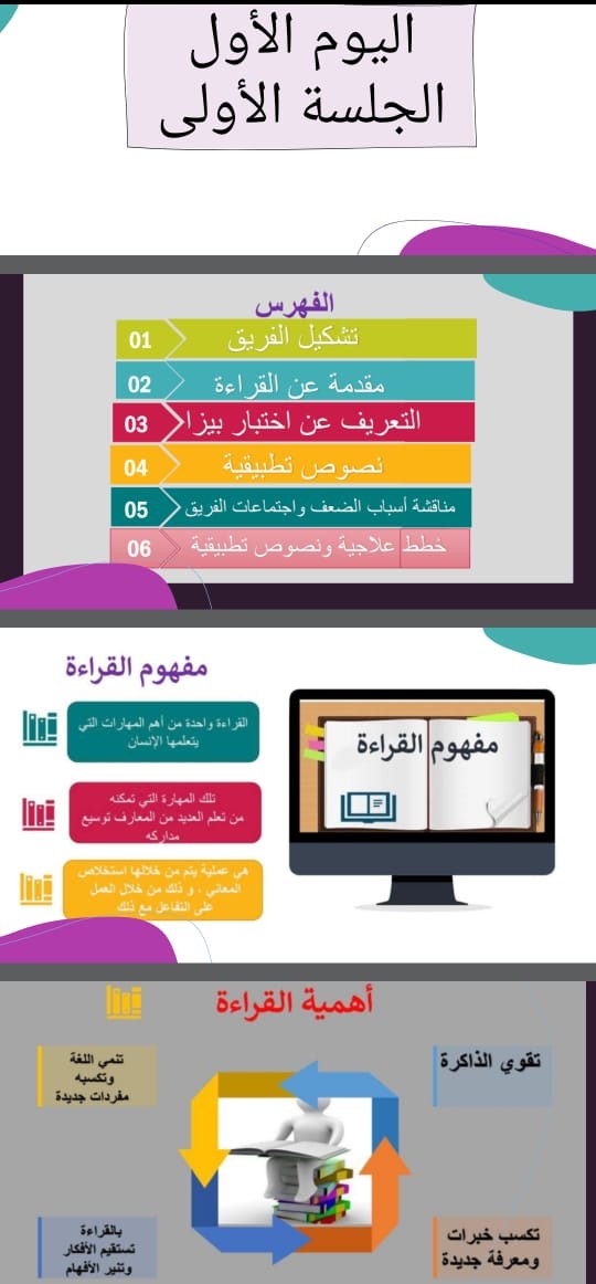 تضمنت الجلسة عدة محاور جرى فيها خلال الجلسة الأولى التحدث عن المفهوم القرآئي وأهميته ومستوياته، وخطوات تنفيذ حصص الفهم القرائي مع تطبيق الأنشطة المتنوعة عليها.