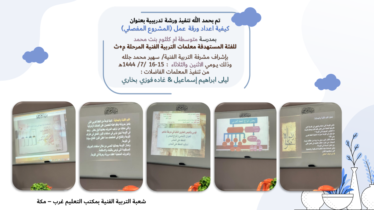 نفذت الإدارة العامة للتعليم بمنطقة مكة المكرمة ممثلة بمكتب تعليم غرب مكة - شعبة التربية الفنية- يومي الإثنين والثلاثاء:15-16/7/1444هـ ورشة تدريبية بعنوان: كيفية إعداد ورقة عمل (المشروع الفصلي) بمقر متوسطة أم كلثوم بنت محمد.