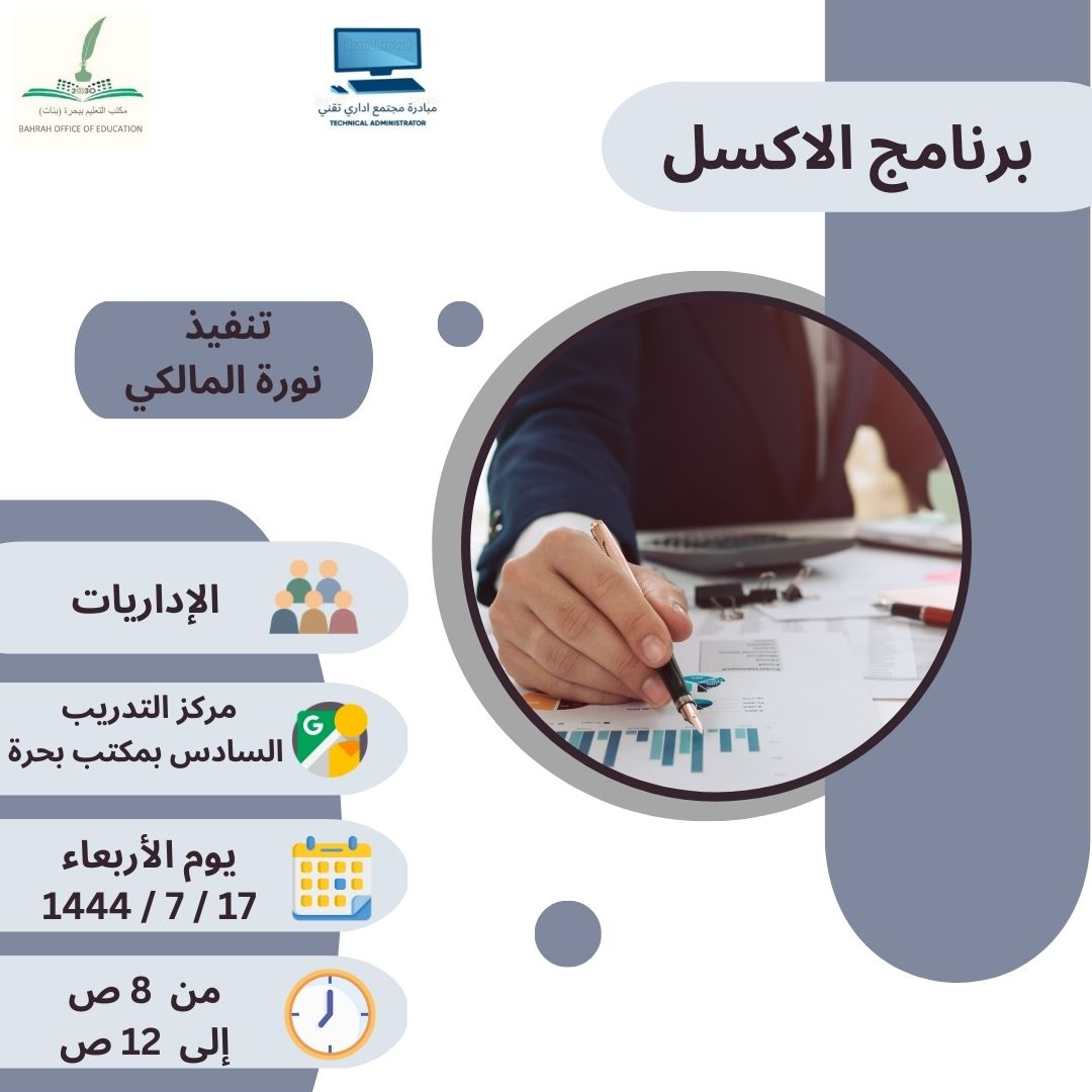 نفذ مكتب تعليم بحرة بالإدارة العامة بالتعليم بمنطقة مكة المكرمة برنامجا تدريبيا بعنوان: الإكسل يوم الأربعاء الموافق 17-7- ـ1444هـ بمركز التدريب السادس ببحره ، نفذته المساعد الإداري نورة المالكي.