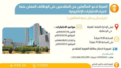 دعت الهيئة العامة للأمن الغذائي، 1443 مؤهلًا من المتقدمين على الوظائف التي طرحتها في 5 يناير 2023م لإجراء الاختبارات الإلكترونية (التخصصية).