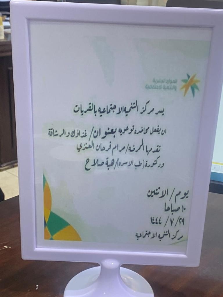 مركز التنمية الاجتماعية بالقريات يقيم محاضرة بعنوان (غذاؤك والرشاقه )