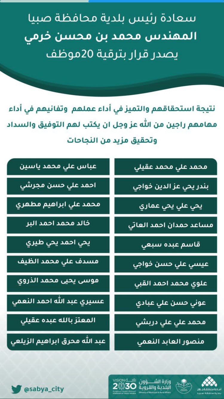 أصدر رئيس بلدية محافظة صبيا المهندس محمد بن محسن خرمي قرارًا بترقية عشرين موظفًا في البلدية وذلك نتيجة استحقاقهم وتميزهم في أداء أعمالهم وتفانيهم في القيام بالمهام الموكلة لهم.