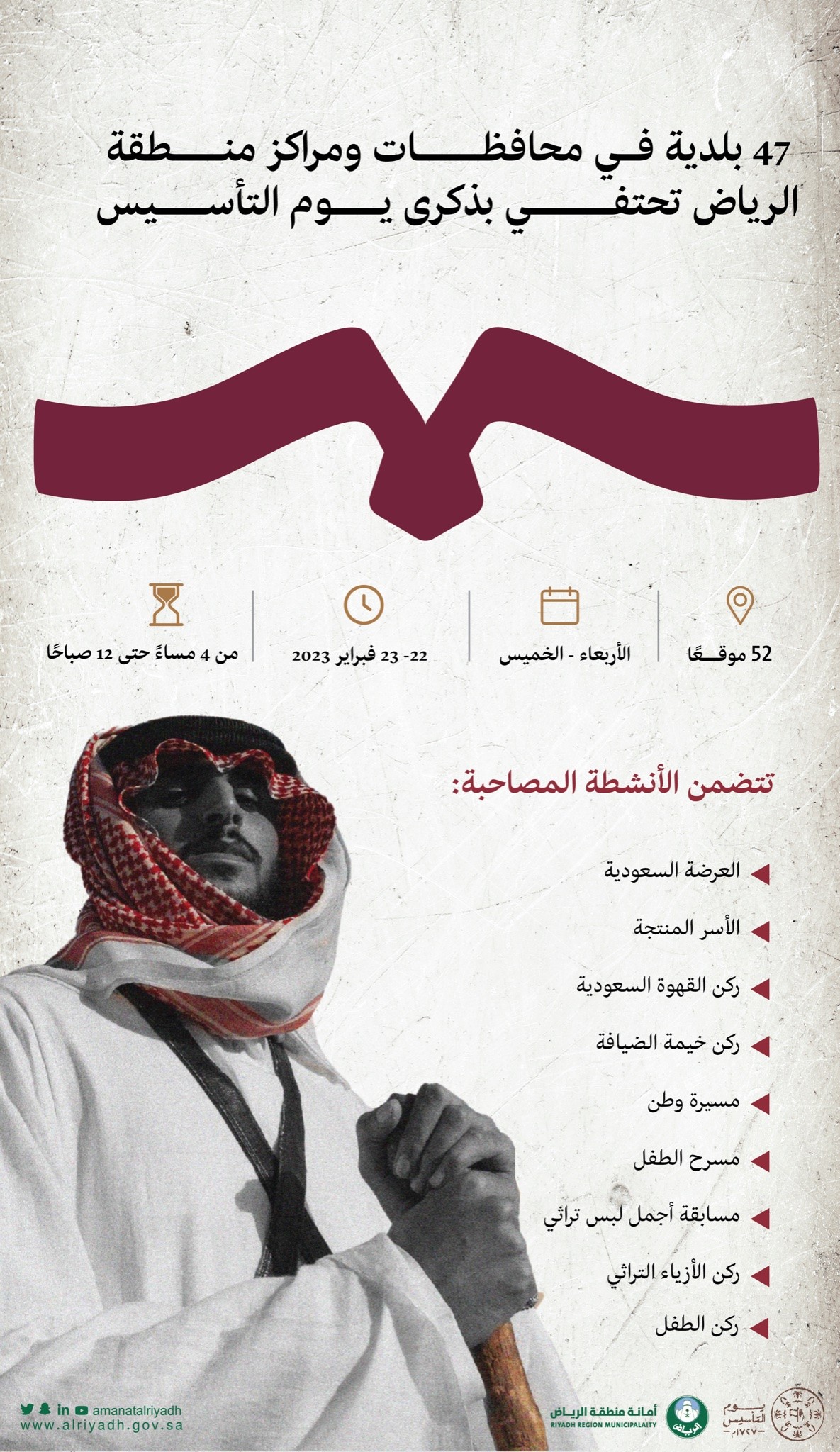 تحتفي أمانة منطقة الرياض في نطاق 47 بلدية في محافظات ومراكز المنطقة بمناسبة ذكرى يوم التأسيس اليوم وغدًا في 52 موقعًا مخصصًا لإقامة الفعاليات واستقبال الزائرين، وذلك ضمن جهودها الهادفة إلى مشاركة السكان فرحتهم وتفاعلهم بالملحمة الوطنية الخالدة.