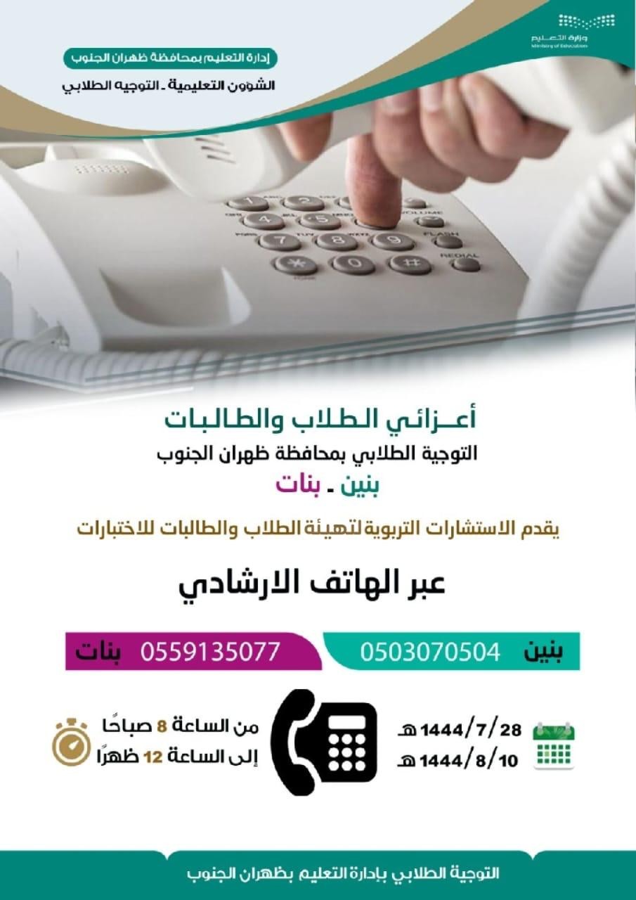 وفي جانب تقديم الدعم النفسي للطلبة، ومساعدتهم في تجاوز أي تحديات قد تواجههم أثناء أداء الاختبارات خصص قسم التوجيه الطلابي هاتف إرشادي للرعاية الطلابية "للبنين " - "للبنات "
