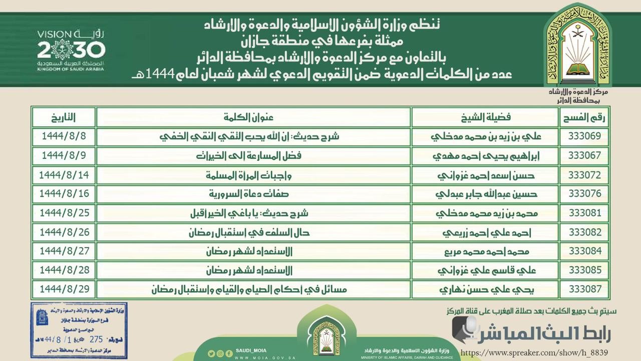 ينظم فرع وزارة الشؤون الإسلامية والدعوة والإرشاد بمنطقة جازان ممثلاً بمركز الدعوة والإرشاد بمحافظة الدائر " بني مالك " عدد من الكلمات الدعوية لشهر شعبان تنطلق مساء اليوم الأربعاء الموافق 9 / 8 / 1444 هـ , بكلمة " فضل المسارعة إلى الخيرات " وتُقام أيضاً كلمات ؛ واجبات المرأة المسلمة وصفات دعاة السرورية وشرح حديث يا باغي الخير أقبل وحال السلف في استقبال رمضان والاستعداد لشهر رمضان ومسائل في أحكام الصيام والقيام واستقبال رمضان , جميعها تنفذ على مدى أيام الشهر وتُبث جميعها عبر رابط البث المُباشر على قناة المركز بعد صلاة المغرب مباشرة .
