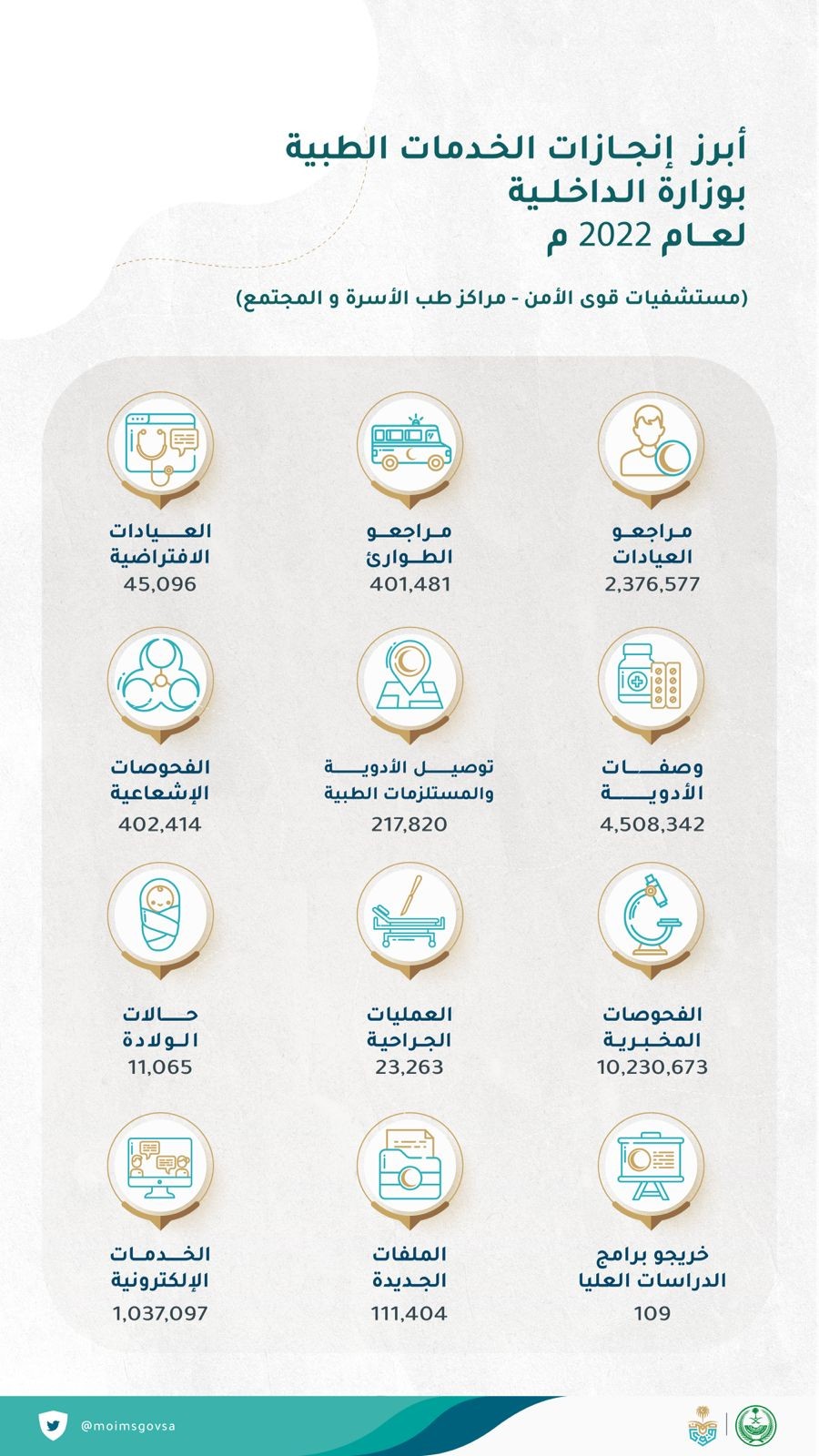 وأوضحت الإدارة العامة للخدمات الطبية بوزارة الداخلية أن عدد مراجعي العيادات بلغ (2,376,577) مراجعًا، وصُرف أكثر من (4,508,342) وصفة دواء، وإجراء (10,230,673) فحصًا مخبريًا، و(402,414) فحصًا بالأشعة بمختلف أنوعها، وبلغ مستفيدي أقسام الطوارئ في مختلف مستشفيات قوى الأمن (401,481) مستفيدًا، ومستفيدي خدمة توصيل الأدوية والمستلزمات الطبية والتغذية العلاجية (217,820) مستفيدًا، وتم تسجيل (1,037,097) طلبًا إلكترونيًا لخدمات المرضى.