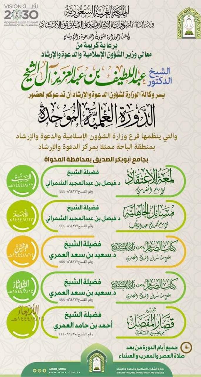 الجدير بالذكر، أن الدورة العلمية الموحدة تنظمها وكالة الوزارة للدعوة والإرشاد في عدد من الجوامع بجميع مناطق المملكة، ويبلغ عددها ٥٠ دورة تستمر لمدة أسبوع، تستهدف الوصول إلى أكثر من مليوني مصلِ ومشاهد في وسائل التواصل الاجتماعي من مختلف شرائح المجتمع، وكذلك الطلاب والطالبات والدعاة والداعيات وطلاب المنح الدراسية، بهدف استثمار أوقات الإجازات.