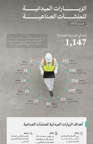 نفذت وزارة الصناعة والثروة المعدنية ممثلة في الإدارة العامة لمراكز الخدمة الشاملة الصناعية وإدارة الالتزام (1147) زيارة ميدانية على المنشآت الصناعية في عدد من مناطق المملكة خلال شهر فبراير الماضي؛ وذلك في إطار جولات الوزارة الدورية لمتابعة المصانع والوقوف على مدى جاهزيتها والتأكد من التزامها بتطبيق معايير الجودة والاشتراطات اللازمة.