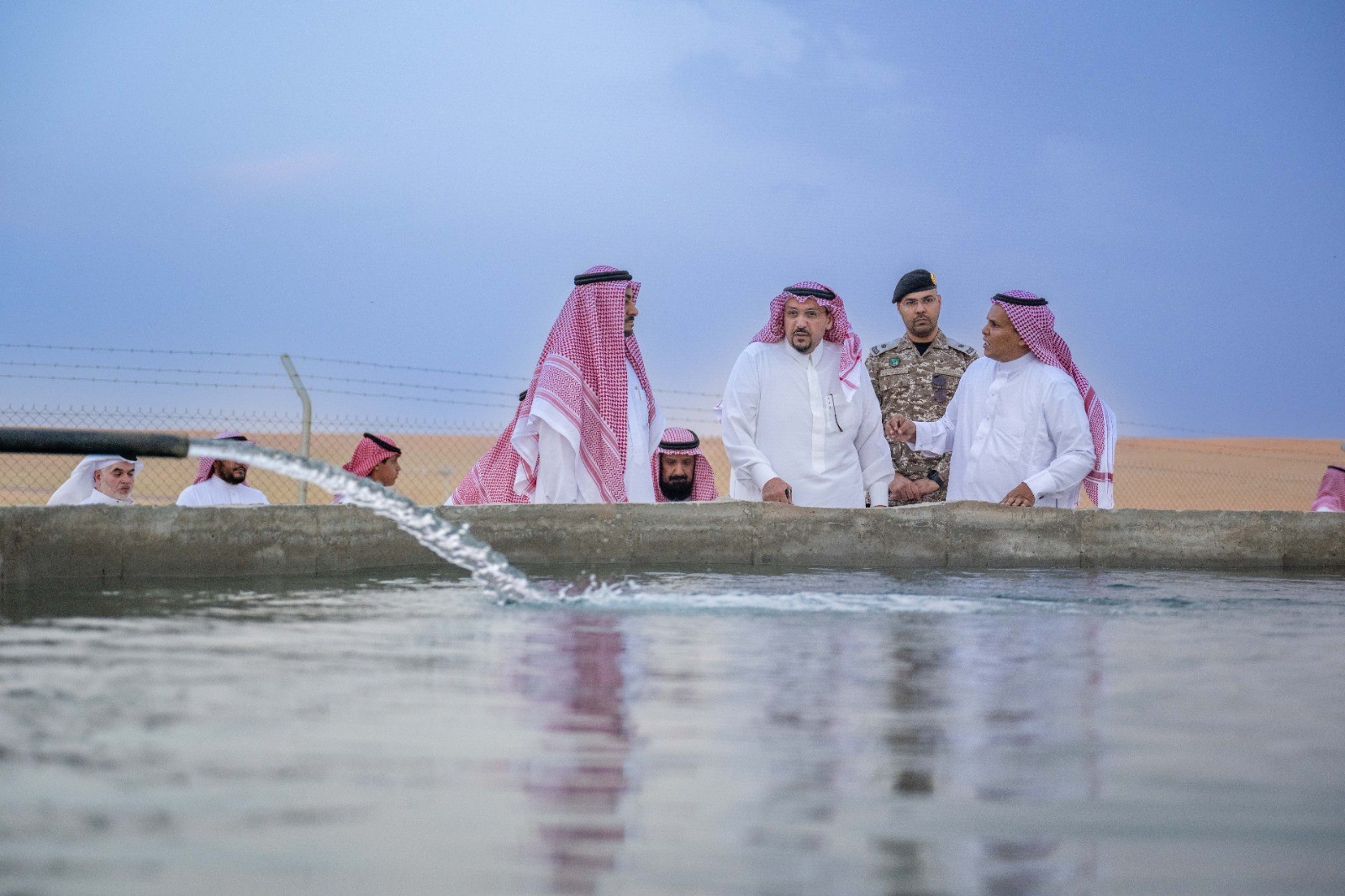 واطلع سموه خلال الزيارة على سير العمل في مورد السقيا، مستمعًا إلى شرح موجز من المشرف على المشروع سالم الوهبي، الذي بيّن أن المشروع يسهم في توفير موارد السقيا للرعاة والبادية، بإشراف من مؤسسة مجتمعي، بالإضافة إلى وجود عدد من الخدمات المتكاملة في مورد المياه، التي تتمثل في المسجد، وخزانات المياه، ودورات المياه، وأحواض لسقي الماشية والإبل.
