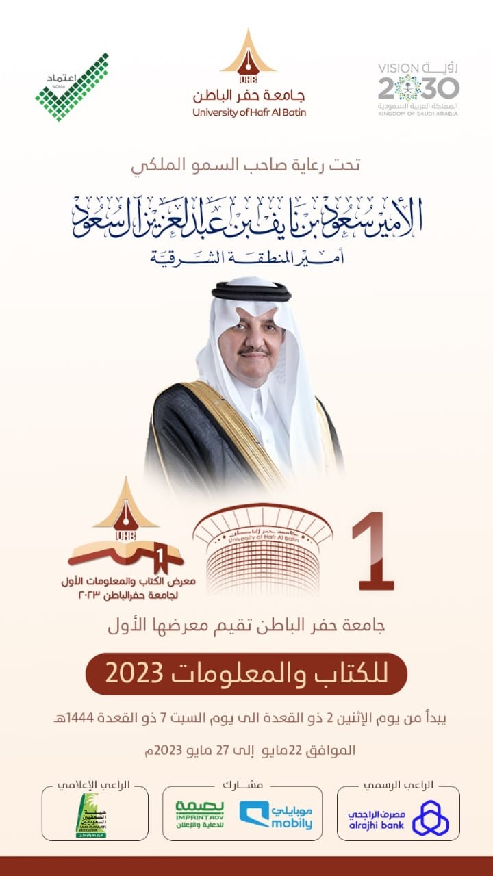 تنطلق فعاليات معرض الكتاب والمعلومات الأول 2023 في محافظة حفر الباطن يوم الإثنين 22 مايو وحتى يوم السبت 27 مايو 2023 م والذي تنظمه جامعة حفر الباطن برعاية كريمة من صاحب السمو الملكي الأمير سعود بن نايف بن عبدالعزيز آل سعود، أمير المنطقة الشرقية في مقر الجامعة بمشاركة أكثر من 40 دار نشر والعديد من الجهات الحكومية والجمعيات الخيرية التوعوية.