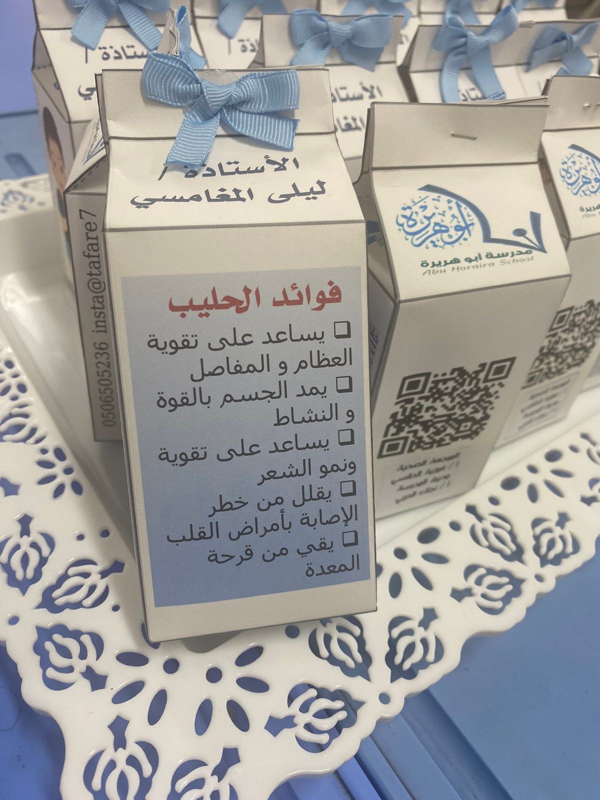 هذا وقد تم توزيع الحليب والتمر وأنواع من الغذاء الصحي كما شاركت الطالبات في توزيعات وعمل مسابقة استخراج مشتقات الحليب من خلال عرض مجموعة صور.