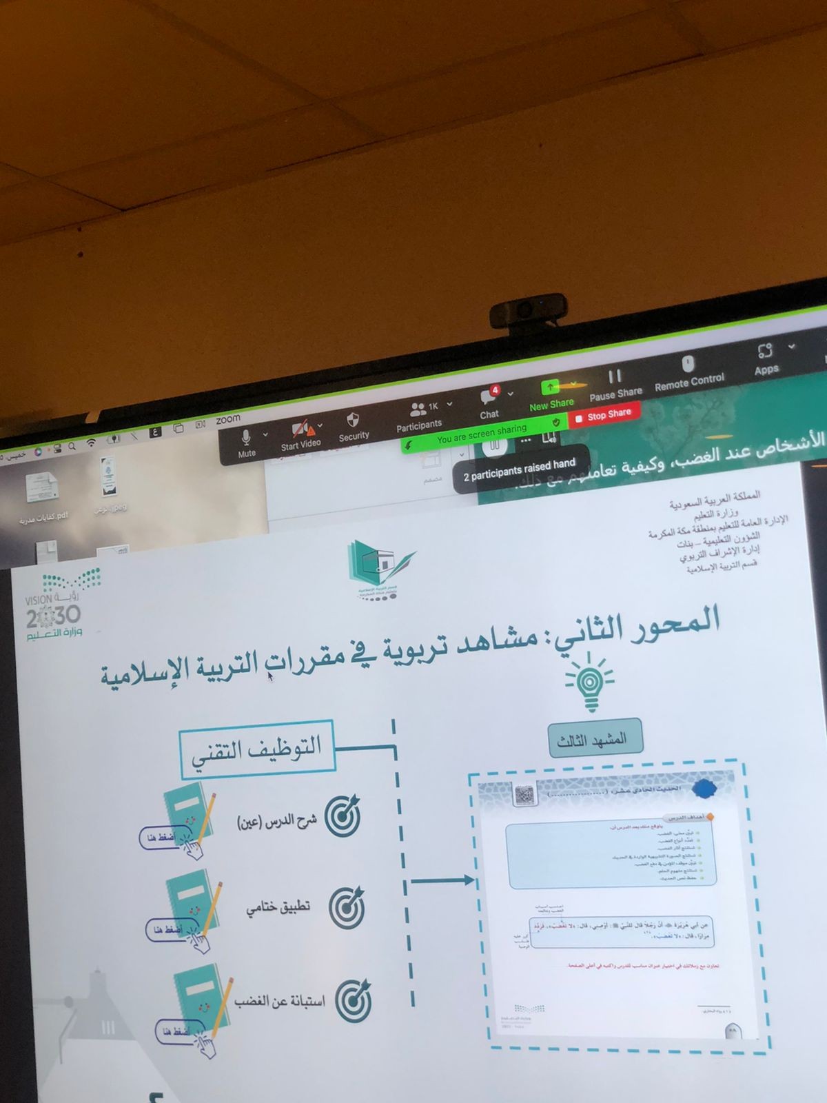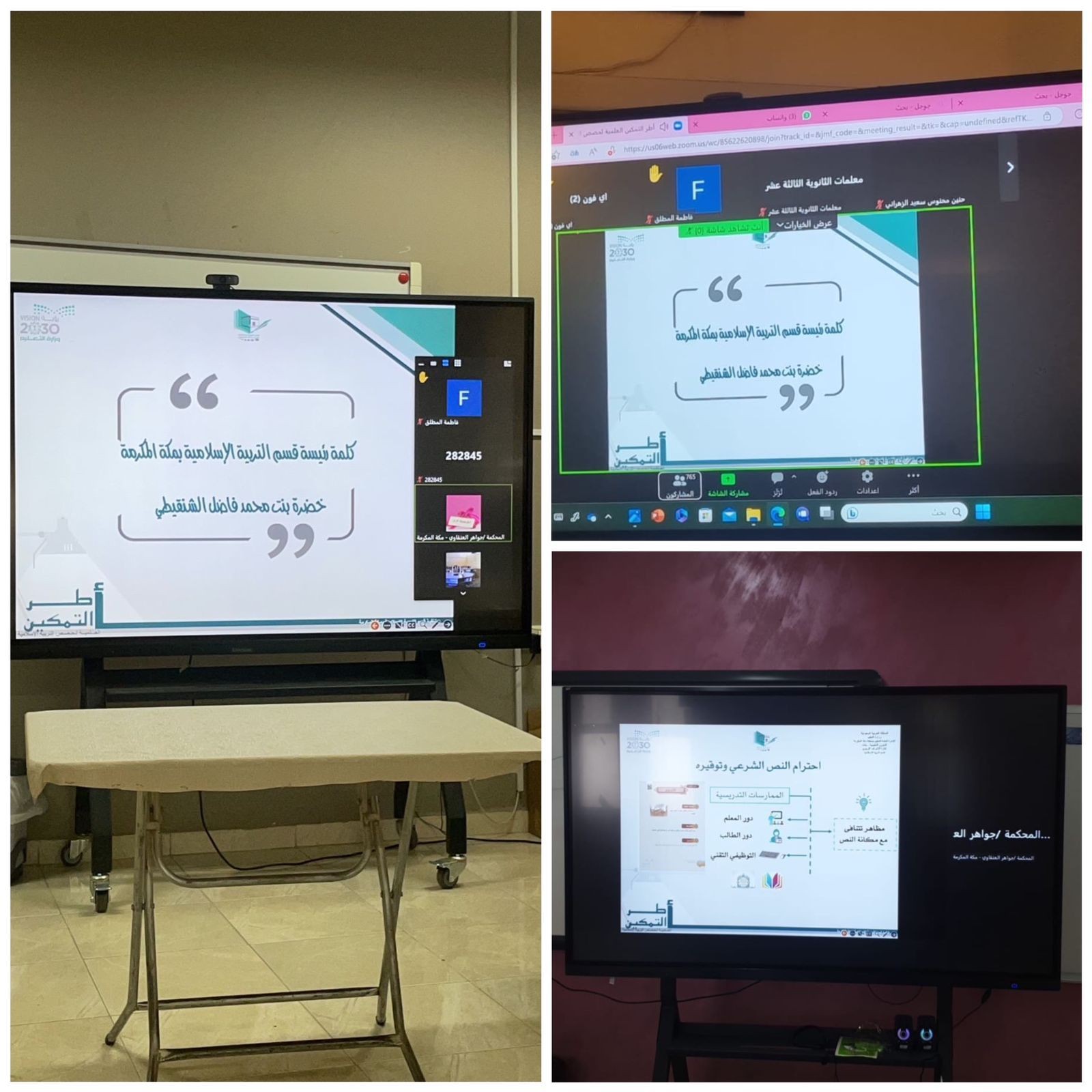 نفذت الإدارة العامة للتعليم بمنطقة مكة المكرمة ممثلة في إدارة الإشراف التربوي - قسم التربية الإسلامية - مجتمع التعلم المهني عبر الشاشة التفاعلية وبرنامج الزوم تحت عنوان " أطر التمكين 2023 العلمية لحصص الدراسات الإسلامية " اليوم الخميس الموافق 1444/11/5هـ والمقام بمتوسطة سودة بنت زمعة ، نفذته كل من المشرفات : جواهر العنقاوي ، شريفة العنزي ,حنان المزروعي ، عائشة العبدلي ، علياء عسيري ، منى الطريف , خضرة الشنقيطي وذلك بمشاركة المعلمات نادية المغامسي من ث/أم كلثوم بنت محمد ووفاء هزازي من م / سودةبنت زمعة رضي الله عنهما حيث استهدف اللقاء المشرفات التربويات والمعلمات على مستوى الإدارات التعليمية لمايقارب عدد 1000 (عبر رابط الزوم للشاشةالتفاعلية) ومشاركة واستقبال البث في جميع مدارس مكة المكرمة بمايقارب 123مدرسة.
