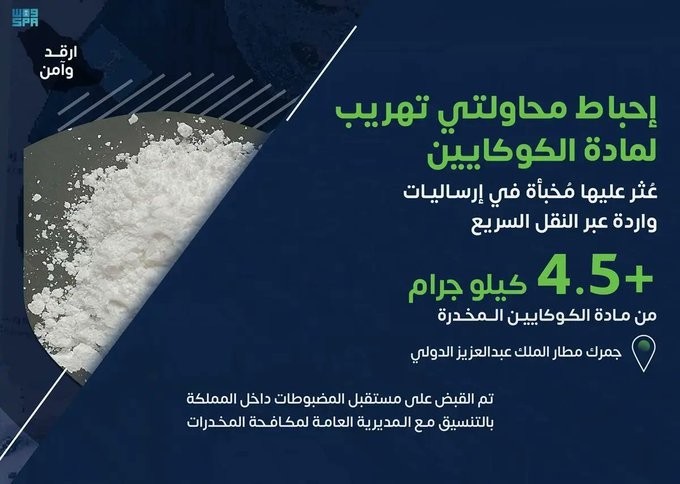 وأوضحت الهيئة أنه عند إجراء عملية الكشف والمعاينة على عدد من الطرود الواردة إلى المملكة عبر النقل السريع، عُثر على تلك الكمية من “الكوكايين”.